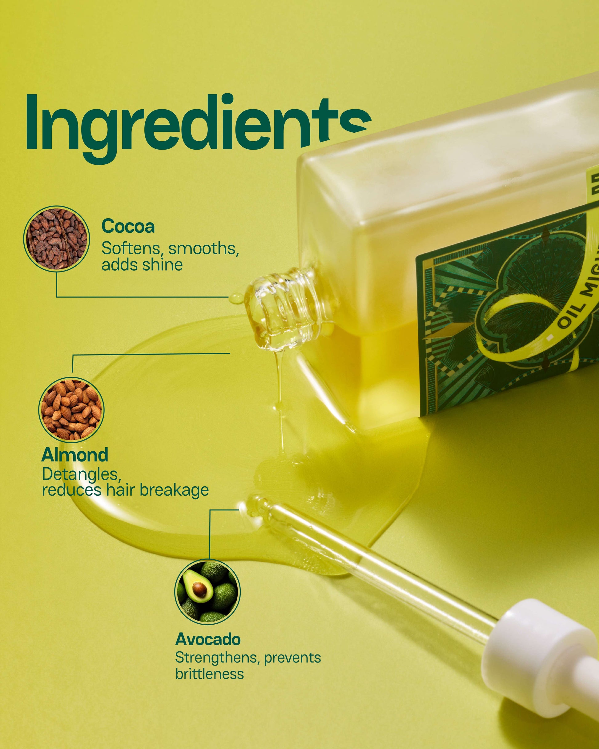 This lightweight, high-performance blend strengthens every strand without stickiness or heaviness. Powered by cocoa, almond, and avocado oils, it fortifies root to tip - shielding against brittleness, and boosting shine.